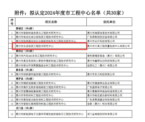 惠州市大禹工程質(zhì)量檢測中心有限公司入選2024年度市工程技術(shù)研究中心擬認(rèn)定名單