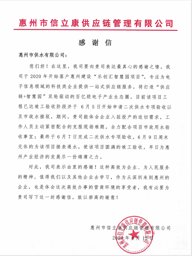 近日,市供水公司收到了一封來(lái)自“樂(lè)創(chuàng)匯智慧園項(xiàng)目”的感謝信。信中,項(xiàng)目方高度認(rèn)可了市供水公司高效為企、實(shí)干為民的精神。作為從深圳進(jìn)駐惠州的企業(yè),他們表示,深刻體會(huì)到了惠州高效辦事的營(yíng)商環(huán)境。這封信折射出的,是市供水公司管道安裝隊(duì)在日常工作中的勤勉盡責(zé)。